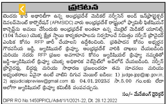 Tender for providers for the implementation of the Family Physician concept in the state of Andhra Pradesh for conducting field level operations of Mobile Medical Units (104 services) across Andhra Pradesh.