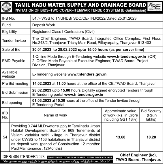 Tender for Providing 0.744 MLD water supply to Tamilnadu Urban Habitat Development Board for 969 Tenements at Vallam vadakku sethi village in Thanjavur district under CWSS to 1153 habitations in Thanjavur district as deposit work (period of Construction 12 months: Paid Maintenance: 12 Months)