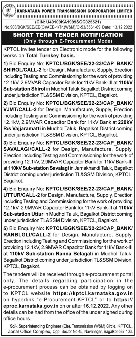 Bid Enquiry No: KPTCL/BGK/SEE/22-23/CAP_BANK/ UTTUR/CALL-2 for Design, Manufacture, Supply, Erection including Testing and Commissioning for the work of providing 12.1kV, 2.9MVAR Capacitor Bank for 11kV Bank-ll at 110kV Sub-station Uttur in Mudhol Taluk, Bagalkot District coming under jurisdiction TL&SSM Division, KPTCL, Bagalkot.