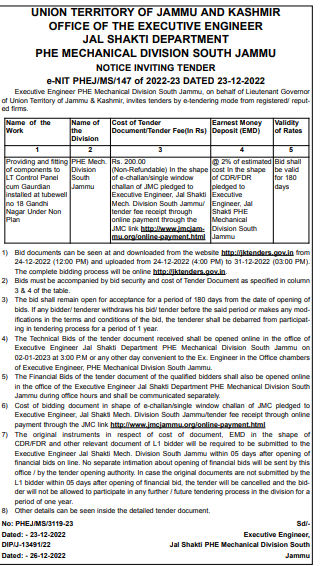 Tender for Providing and fitting of components to LT Control Panel cum Gaurdian installed at tubewell no 18 Gandhi Nagar Under Non Plan PHE Mech.