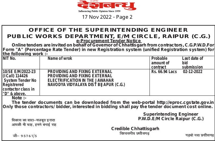 Tender for PROVIDING AND FIXING EXTERNAL PROVIDING AND FIXING EXTERNAL ELECTRIFICATION IN THE JAWAHAR NAVODYA VIDYALAYA DIST BIJAPUR (C.G.)