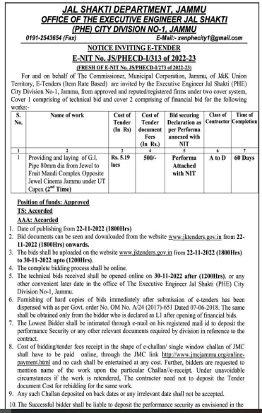 Tender for Providing and laying of G.L. Pipe 80mm dia from Jewel to Fruit Mandi Complex Opposite Jewel Cinema Jammu under UT Capex (2 Time)