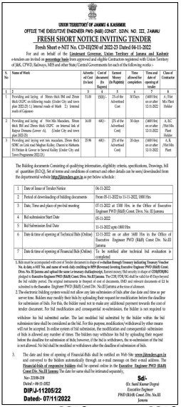 Tender for Providing and laying of Wet Mix Macadam, 50mm thick BM and 25mm thick OGPC on Internal link of Raipur Domana (Lower-A). (Under City and town plan 2022-23)