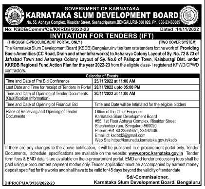 Tender for Providing Basic Amenities (CC Road, Drain and other Infra works) to Asharaya Colony Layout of Sy. No. 72 & 73 of Jafrabad Town and Asharaya Colony