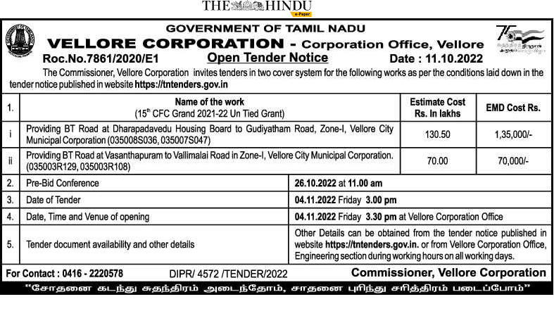 Providing BT Road at Dharapadavedu Housing Board to Gudiyatham Road, Zone-I, Vellore City Municipal Corporation (035008S036, 035007S047)