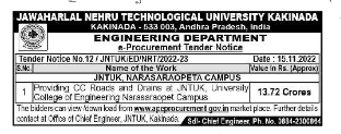 Tender for Providing CC Roads and Drains at JNTUK, University College of Engineering Narasaraopet Campus