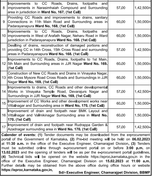 Tender for Providing CC Roads and improvements to drains, sanitary Connections in 11th Main Road and Surrounding areas in Padarayanapura Ward No. 168. (1st Call)