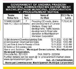 TENDER FOR Providing CC roads, drains and Development of Central Medians. Green bet development. Trafic Islands development & Roadside plantation in Machilipanam Municipal Corporation