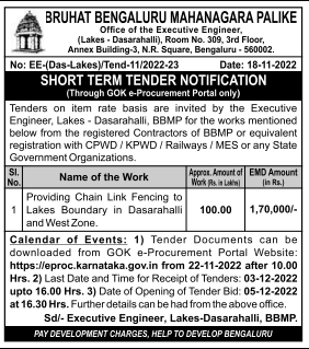 Tender for Providing Chain Link Fencing to Lakes Boundary in Dasarahalli and West Zone.