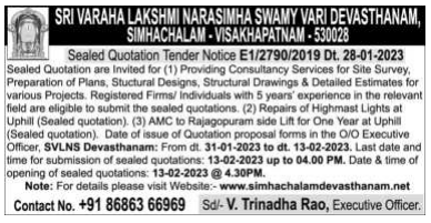 (1) Providing Consultancy Services for Site Survey. Preparation of Plans, Stuctural Designs, Structural Drawings & Detailed Estimates for various Projects. Registered Firms/ Individuals with 5 years’ experience in the relevant field are eligible to submit the sealed quotations. (2) Repairs of Highmast Lights at Uphill (Sealed quotation). (3) AMC to Rajagopuram side Lift for One Year at Uphill (Sealed quotation).
