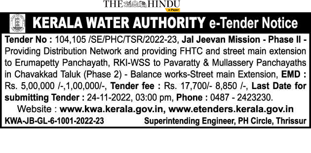 Providing Distribution Network and providing FHTC and street main extension to Erumapetty Panchayath, RKI-WSS to Pavaratty & Mullassery Panchayaths in Chavakkad Taluk (Phase 2) – Balance works-Street main Extension,