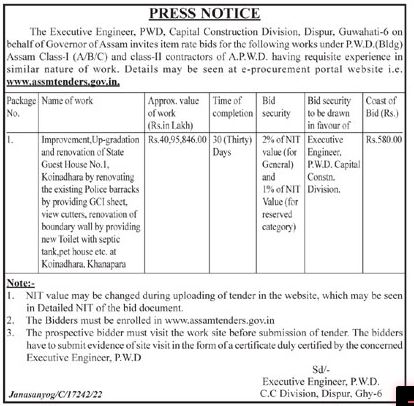Improvement, Up-gradation and renovation of State Guest House No.1, Koinadhara by renovating the existing Police barracks by providing GCI sheet, view cutters, renovation of boundary wall by providing new Toilet with septic tank,pet house etc. at