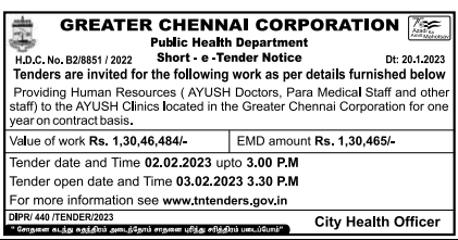 Tender for Providing Human Resources (AYUSH Doctors, Para Medical Staff and other staff) to the AYUSH Clinics located in the Greater Chennai Corporation for one year on contract basis.