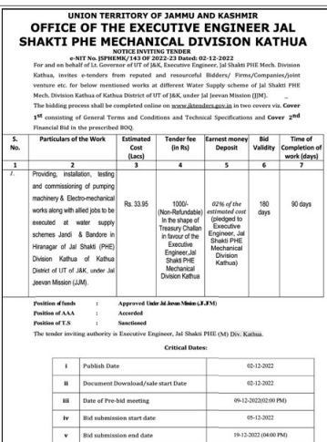Tender for Providing, installation, testing and commissioning of pumping machinery & Electro-mechanical works along with allied jobs to be executed at water supply schemes Jandi & Bandore in Hiranagar of Jal Shakti (PHE) Division Kathua of Kathua District of UT of J&K, under Jal Jeevan Mission (JJM) Estimated Cost