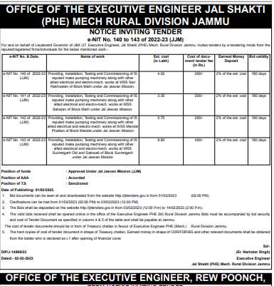 Tender for Providing, Invatationing and Commissioning of 15 reputed make pumping machinery along with other alled electrical and electro-mech works at WSS Sahara of Block Marh under Jeevan Mission