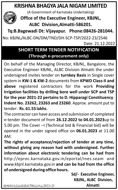 Providing Irrigation facilities by drilling bore well under SCP and TSP for the year 2021-22 pertains to D. Hipparagi Constituency.