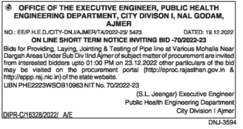 Tender for Providing, Laying, Jointing & Testing of Pipe line at Various Mohalla Near Dargah Areas Under Sub Div IInd Ajmer of subject matter of procurement