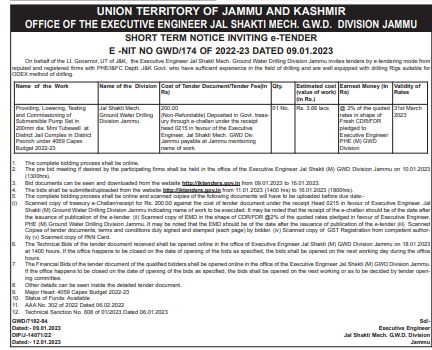Tender for Providing Lowering, Testing and Commissioning of Submersible Pump Set in 200mm dia. Mini Tubewell t District Jail Complex in District Poonch under 405 Cape Budget 2022-23