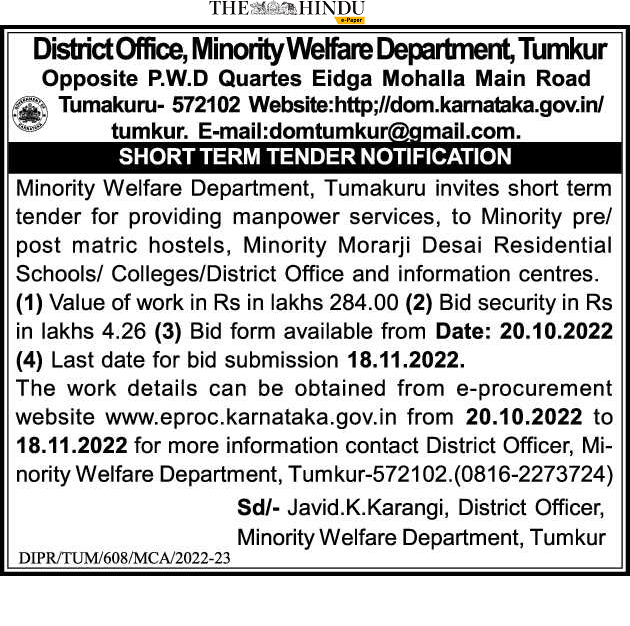 Tender for providing manpower services, to Minority pre/ post matric hostels, Minority Morarji Desai Residential Schools/ Colleges/District Office