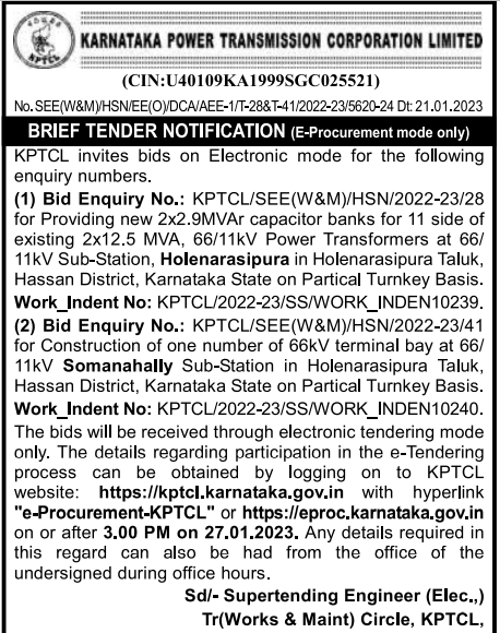 Tender for Providing new 2×2.9MVAr capacitor banks for 11 side of existing 2×12.5 MVA, 66/11KV Power Transformers at 66/ 11kV Sub-Station, Holenarasipura in Holenarasipura Taluk, Hassan District, Karnataka State on Partical Turnkey Basis.