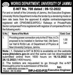 Tender for Providing power connection only to the 07 Nos. A.C’s proposed to be installed in Seminar Hall, Old Semi- nar Hall & RUSA Lab. of Department of Physics at New University Campus, Jammu