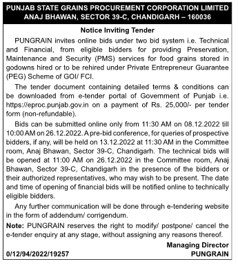 Tender for providing Preservation, Maintenance and Security (PMS) services for food grains stored in godowns hired or to be rehired under Private Entrepreneur Guarantee (PEG) Scheme of GOI/ FCI.