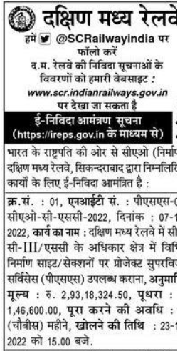 Tender for Providing Project Supervision Services (PSS) at various construction sites/sections under the jurisdiction of CC-III/SC in South Central Railway