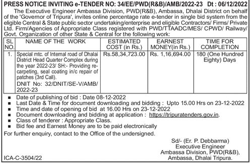 Tender for Special mtc. of Internal road of Dhalai District Head Quarter Complex during the year 2022-23/ SH:- Providing re- carpeting, seal coating in/c repair of patches (3rd Call). DNIT No: 32/DNIT/SE-V/AMB/ 2022-23