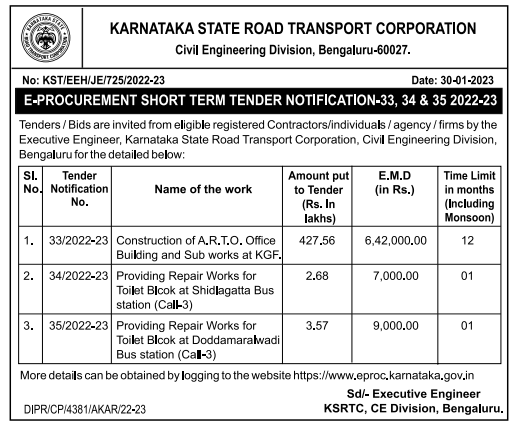 Tender for Providing Repair Works for Toilet Blcok at Doddamaralwadi Bus station (Call-3)