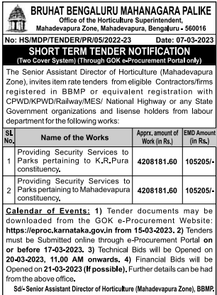 Tender for Providing Security Services to Parks pertaining to K.R.Pura constituency.