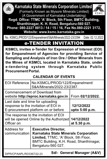 Tender for providing Service of Sampling and Analysis of Iron Ore / Other Minerals from the Mines of KSMCL located in Karnataka State