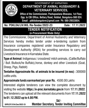 Tender for providing services to carry out Livestock Insurance in Karnataka State.