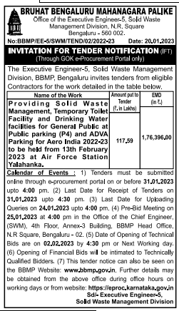 Tender for Providing Solid Waste Management, Temporary Toilet Facility and Drinking Water facilities for General Public at Public parking (P4) and ADVA Parking for Aero India 2022-23 to be held from 13th February 2023 at Air Force Station It disappeared.
