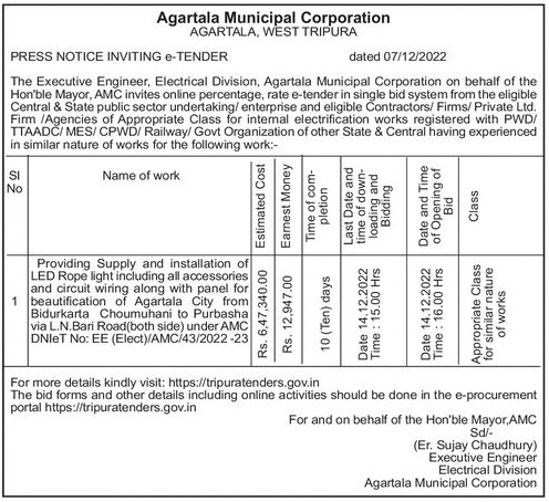 Tender for Providing Supply and installation of LED Rope light including all accessories and circuit wiring along with panel for 1 beautification of Agartala City from Bidurkarta Choumuhani to Purbasha via L.N.Bari Road(both side) under AMC DNIET No: EE (Elect)/AMC/43/2022-23