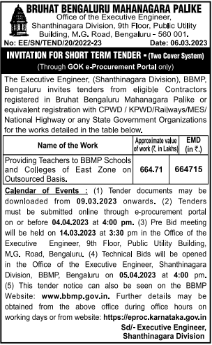 Tender for Providing Teachers to BBMP Schools and Colleges of East Zone on Outsourced Basis.