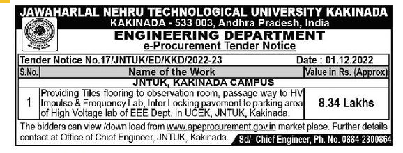 Tender for Providing Tiles flooring to observation room, passage way to HV Impulse & Frequency Lab, Inter Locking pavement to parking arca of High Voltage lab of EEE Dept. in UČEK, JNTUK, Kakinada.