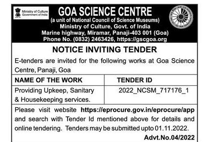 E-tenders are invited for the following works at Goa Science