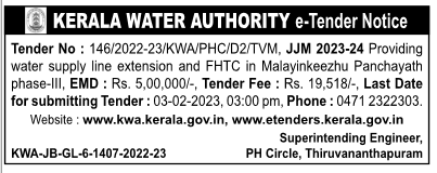 Tender for Providing water supply line extension and FHTC in Malayinkeezhu Panchayath phase-III,
