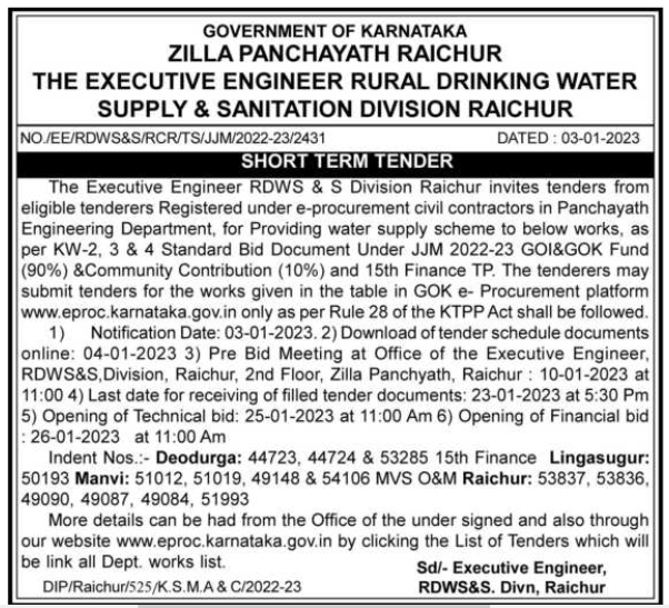 Tender for Providing water supply scheme to below works, as per KW-2, 3 & 4 Standard Bid Document Under JJM 2022-23 GOI&GOK Fund (90%) &Community Contribution (10%) and 15th Finance TP.