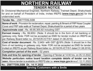 Tender for Provision for reclamation, repair, painting & fitment of FRP Nose Coupler Cover and FRP side walls at Trainset Depot, Shakurbasti for a period of two years