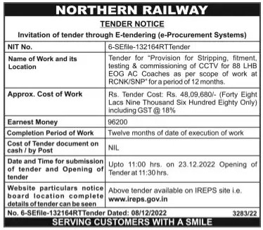 Tender for “Provision for Stripping, fitment, testing & commissioning of CCTV for 88 LHB EOG AC Coaches as per scope of work at RCNK/SNP for a period of 12 months.
