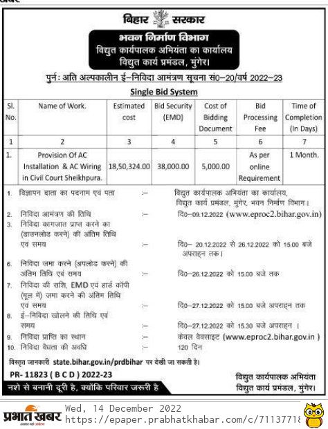 Tender for Provision Of AC Installation & AC Wiring in Civil Court Sheikhpura.