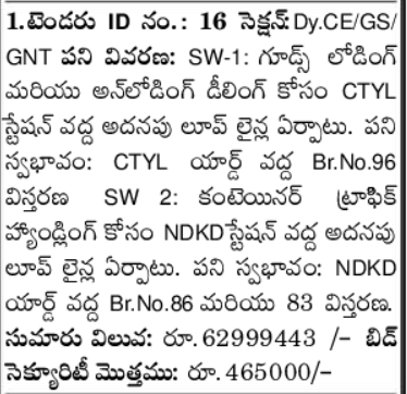 Tender for : Provision of additional loop lines at NDKD station for container traffic handling. Nature of Work: At NDKD Yard Br. No. 86 and 83 expansion
