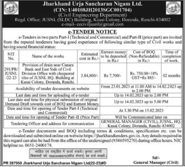 Tender for Provision of drain near Canara Bank and East Side of Civil Division Office with chequered tiles of JUSNL HQ. Building at Kusai Colony, Doranda, Ranchi,