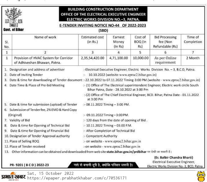 Tender for Provision of HVAC System for Corridor of Adhiveshan Bhawan, Patna.