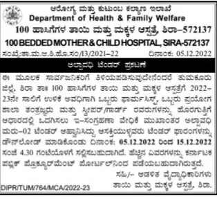 Tender for provision of one Pharmacist, one Trial School Technician and Nurse/Guard for the remaining period of 2022-23 for 100 bedded Mother and Child Hospital, Shira Tha, Tumkur District through e-procurement platform
