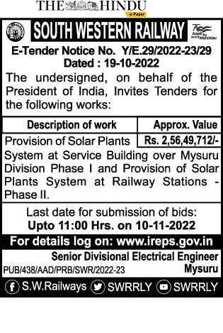 Tender for Provision of Solar Plants Rs. 2,56,49,712/ System at Service Building over Mysuru Division Phase I and Provision of Solar Plants System at Railway Stations – Phase II.