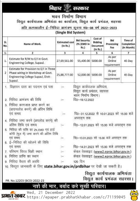 Tender for Provision to E/I in Three 2 Phase wiring in Workshop at Govt. Engineering College Supaul, Distt-
