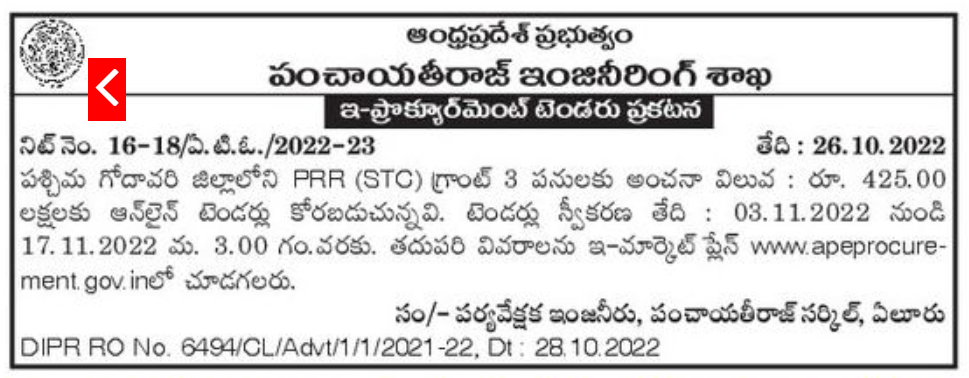 Tender for PRR (STC) Grant 3 works in West Godavari District
