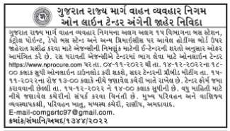 Tender for publishing advertisement on Hoardings Boards at bus stations, control points, depot bus stands and other premises of different 15 divisions of Gujarat State Road Transport Corporation. Interested agency to participate in the tender online tender at https://www.nprocure.com dt.